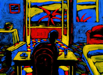 Un personnage assoupi dans une chambre d’hôtel